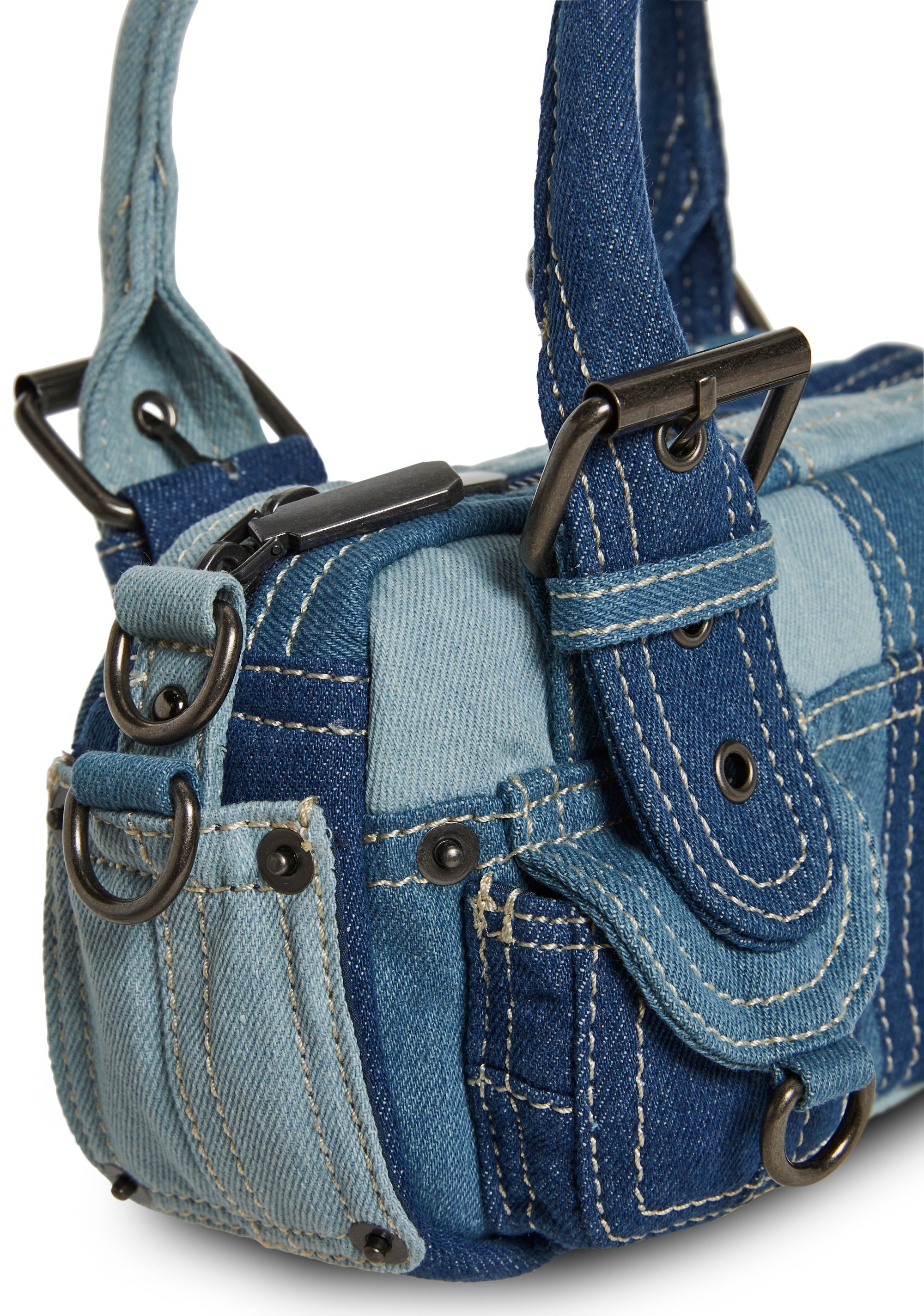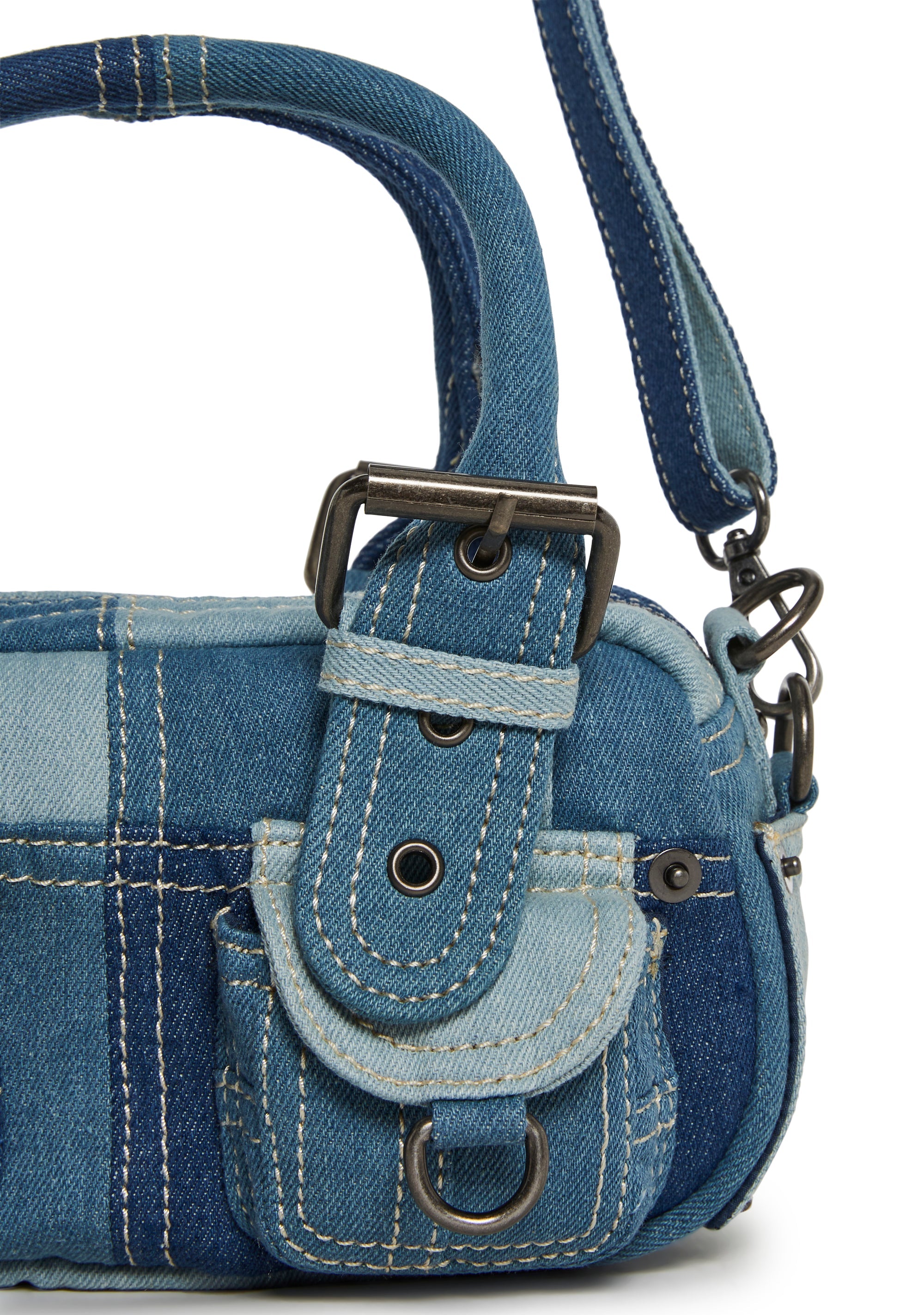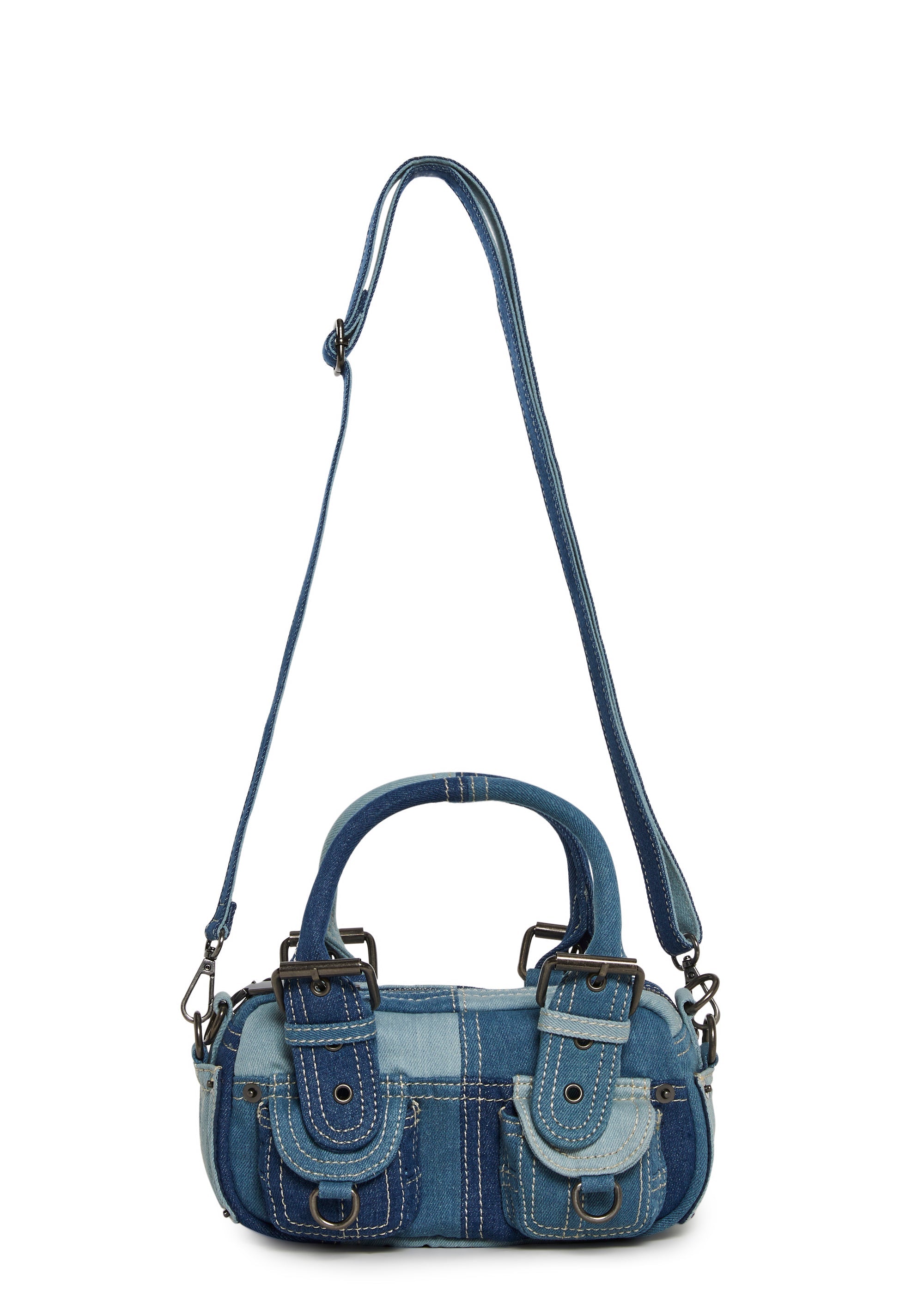 Channel a cool, laid-back vibe with this compact mini bag crafted in mixed-wash denim patchwork. Featuring contrast stitching and utility-inspired front pockets, this piece blends street style with a playful, vintage feel.