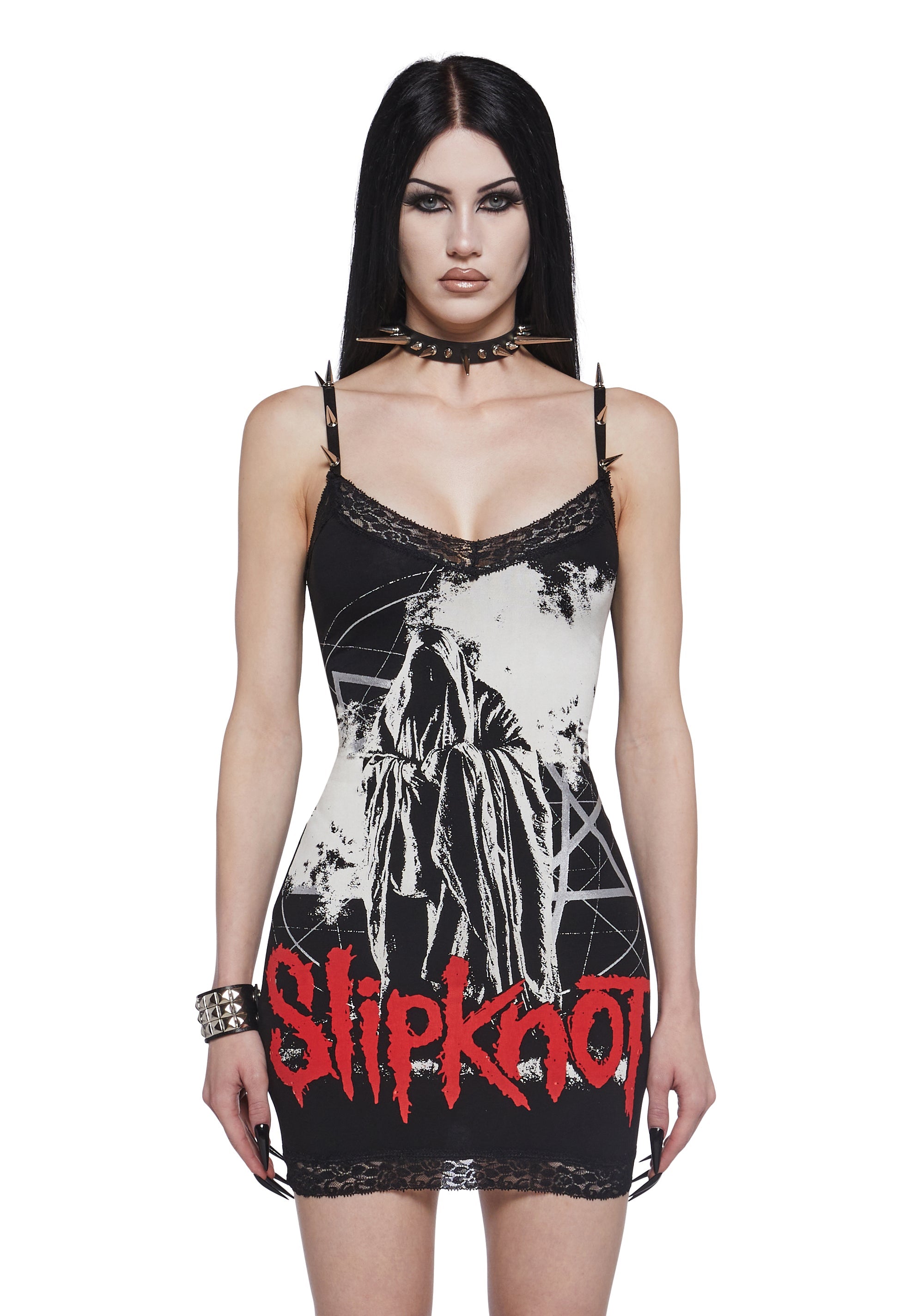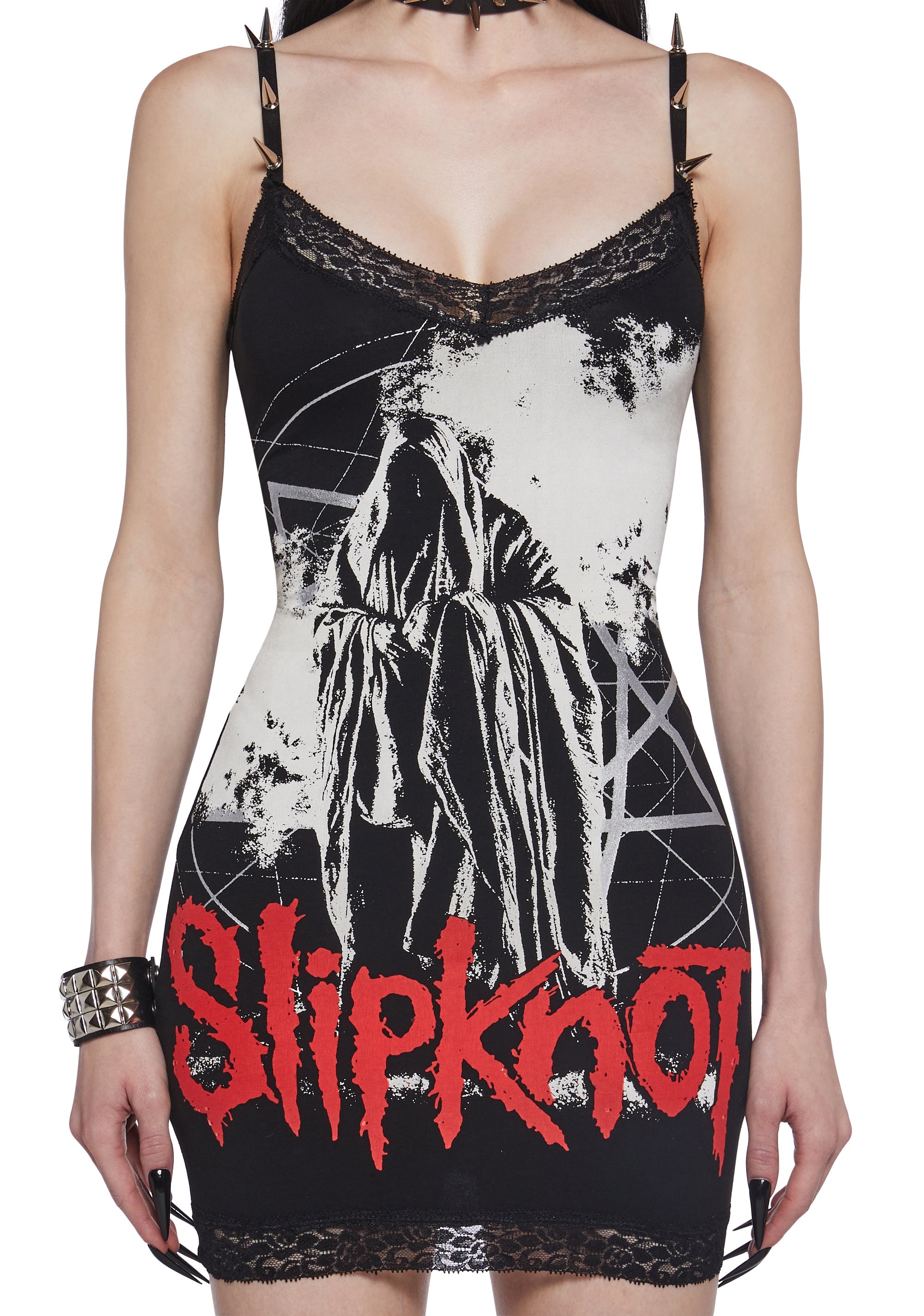 This mini dress has a grim reaper graphic on the front and back with Slipknot band logo, a lace trim, and adjustable shoulder straps with spiked details.