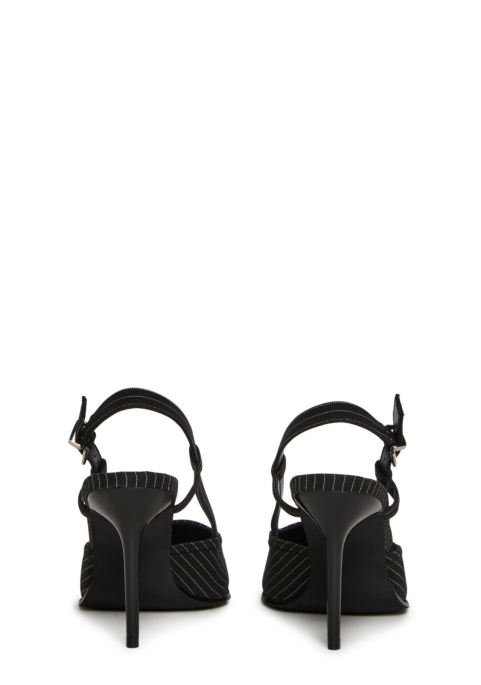 These pumps have a pointed toe design, an all over striped design, stiletto heels, and adjustable buckle closure.