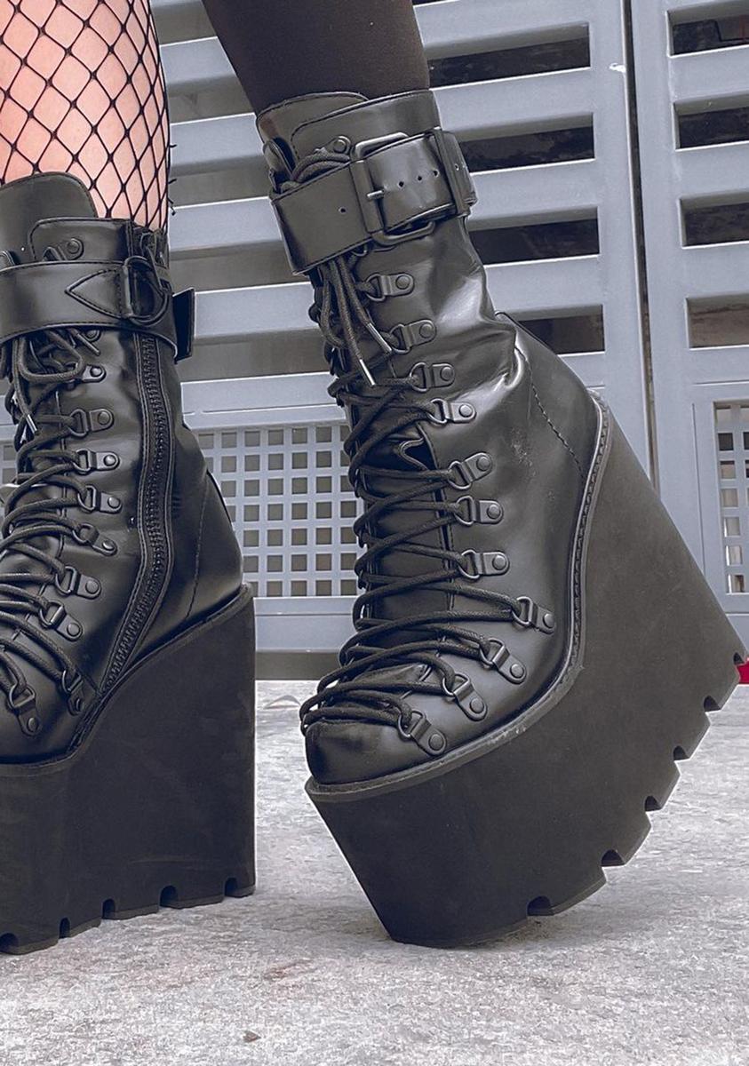 cuz once ya do a double-cross, ya gotta be ready to fight! These gnarly platform boots feature a sleek black vegan leather construction, ultra high wedge heels and platforms with cutout treads, laces that run all the way down to the toe, matte black hardware, wrapped calf straps with adjustable buckles, and side zip closures.