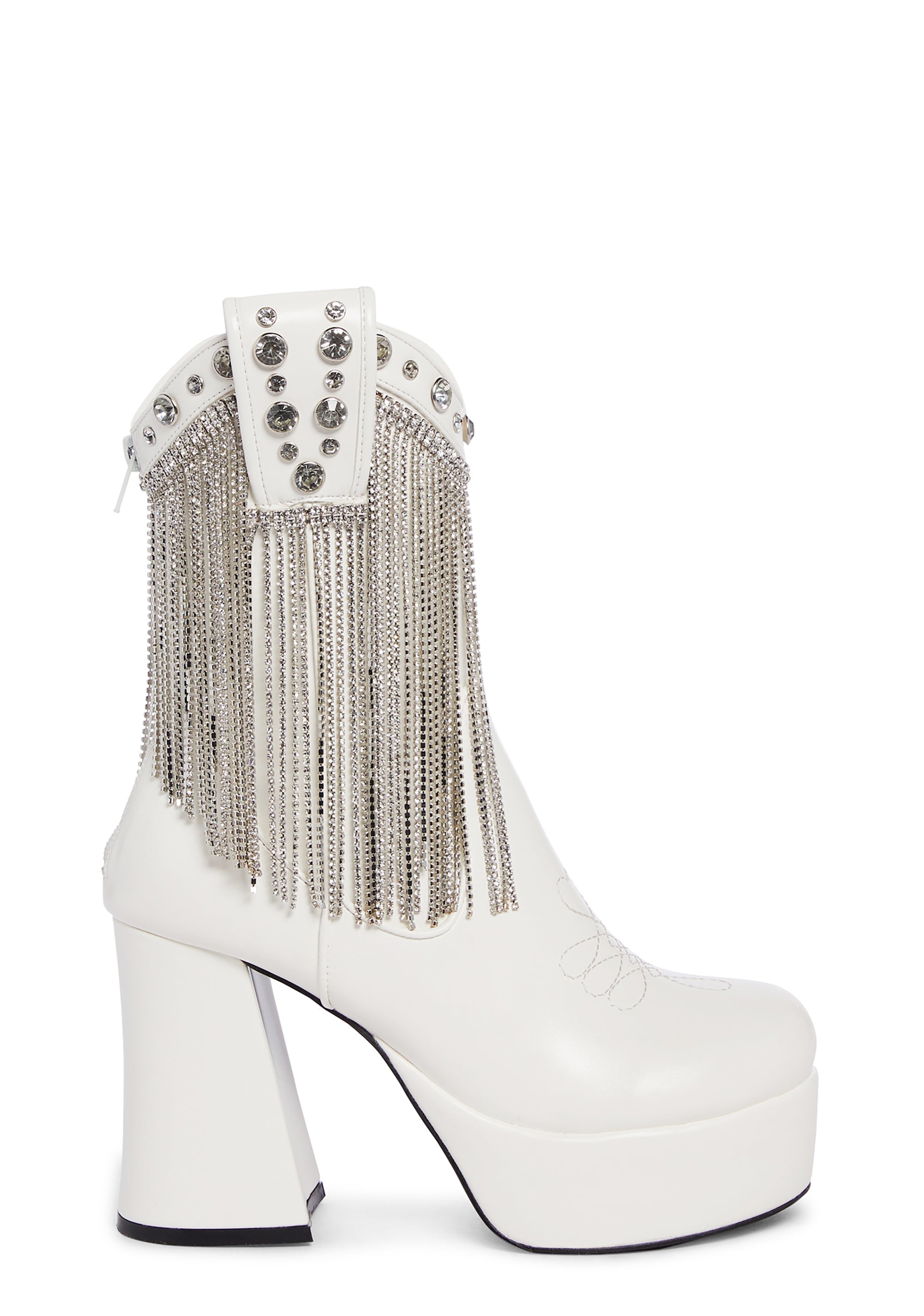 cuz your love sparkles wherever it goes. These western inspired platform booties have a vegan leather construction, platform soles, block heels, jewel studs, rhinestone fringe detailing, decorative stitching on the uppers, and back zipper closures.