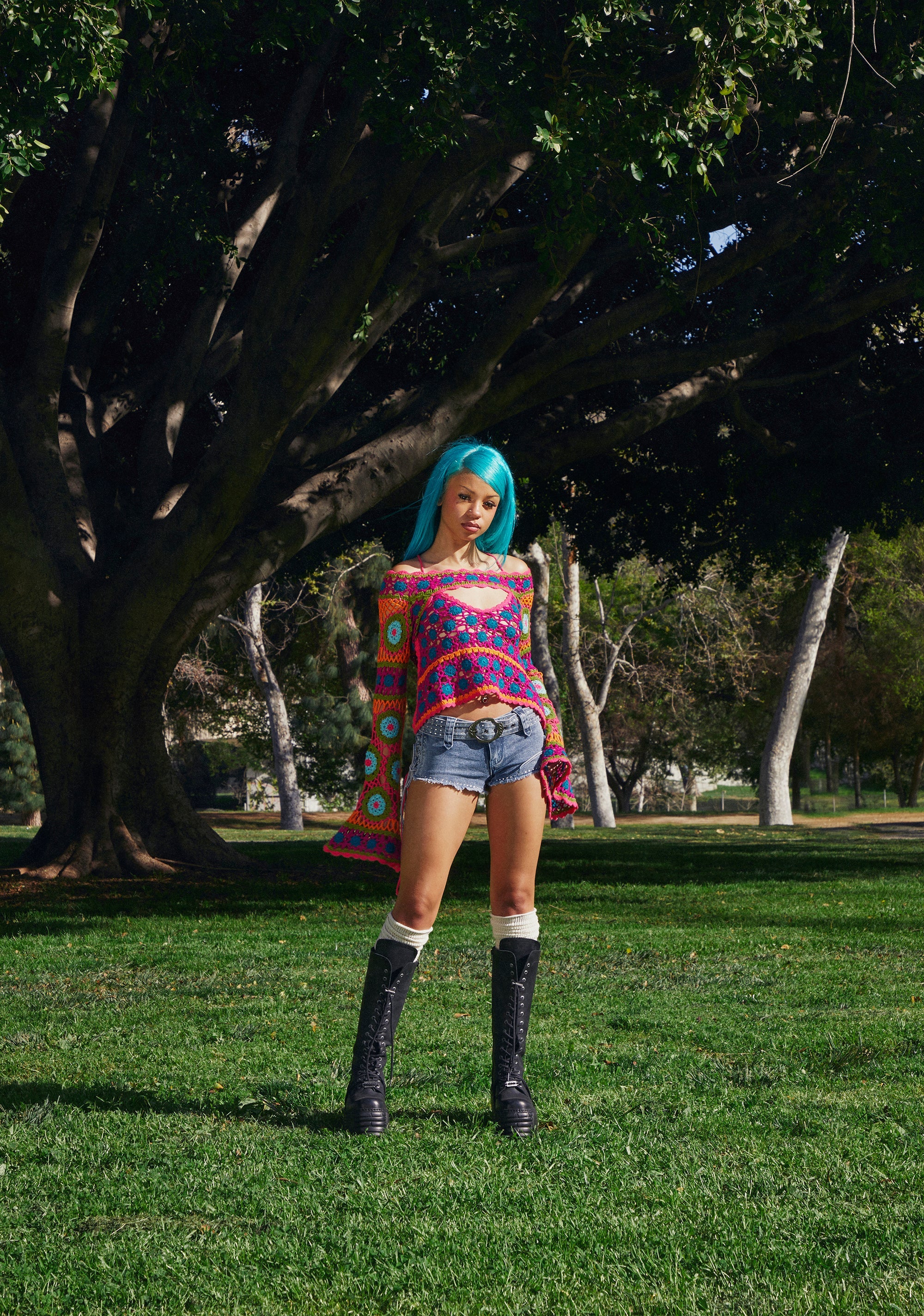This tank top has a semi sheer crochet construction, a multicolored design, a cropped fit, and an open back with adjustable tie closures.
