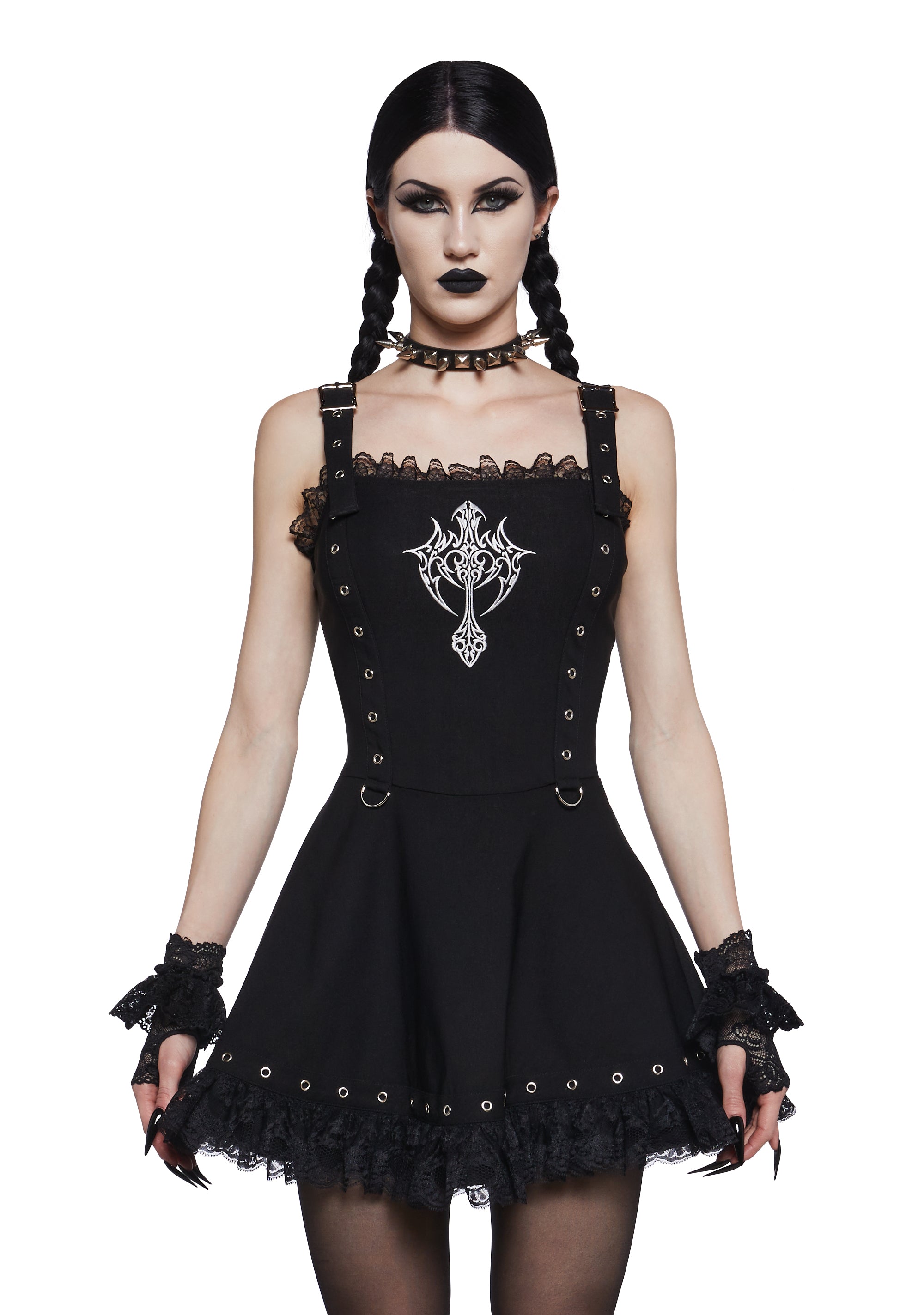 cuz you're cursed for life. This fit & flare mini dress has an embroidered cross on the chest, eyelet detailing, scalloped lace trim, and adjustable buckle straps.