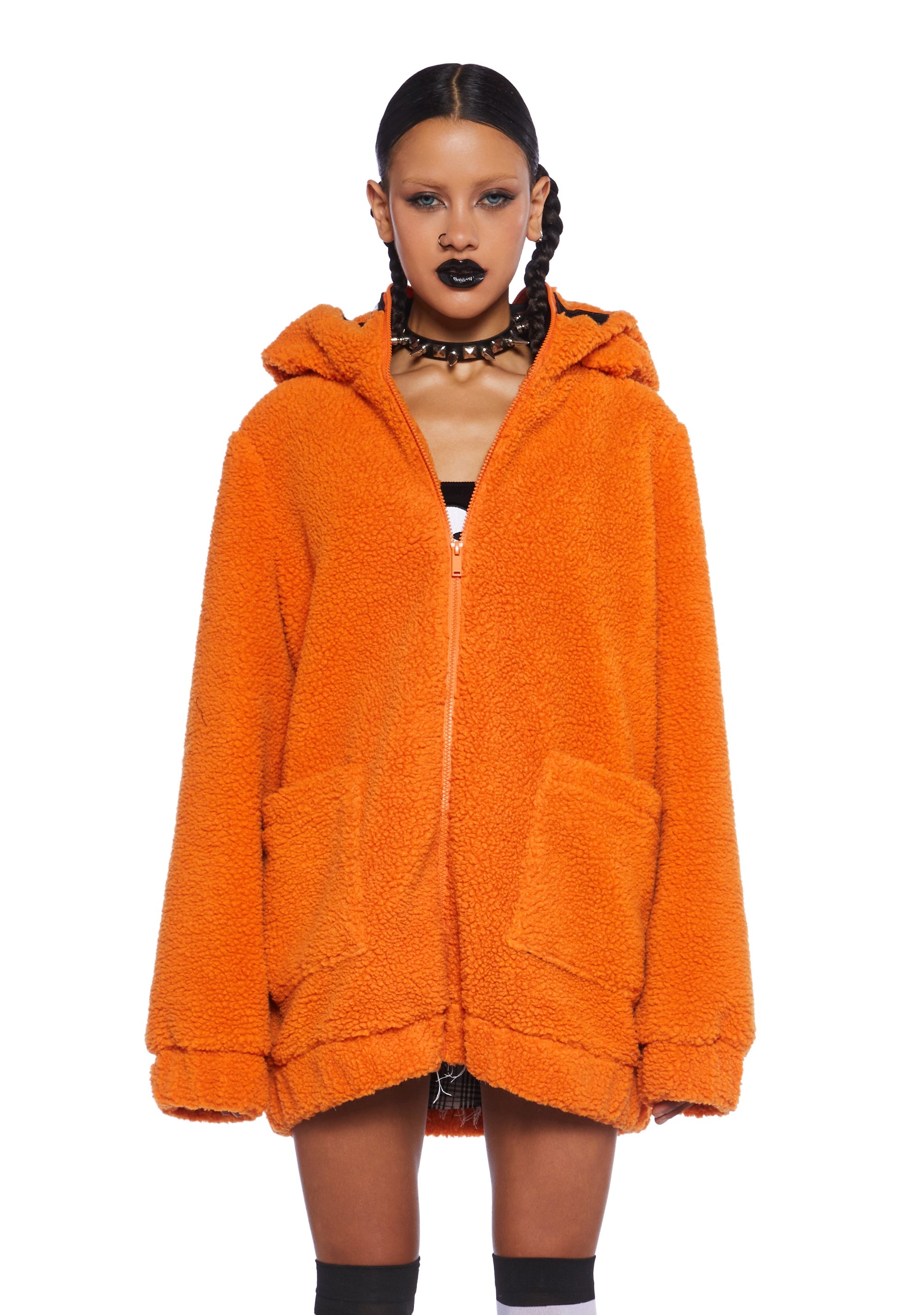 Scare them into pulling that zipper with this hoodie that has a plush faux fur construction, a front zipper closure that zips all the way to the hoodie which forms a pumpkin head jack o- lantern design with cut out details, square front pockets, long sleeves, and an oversized fit.