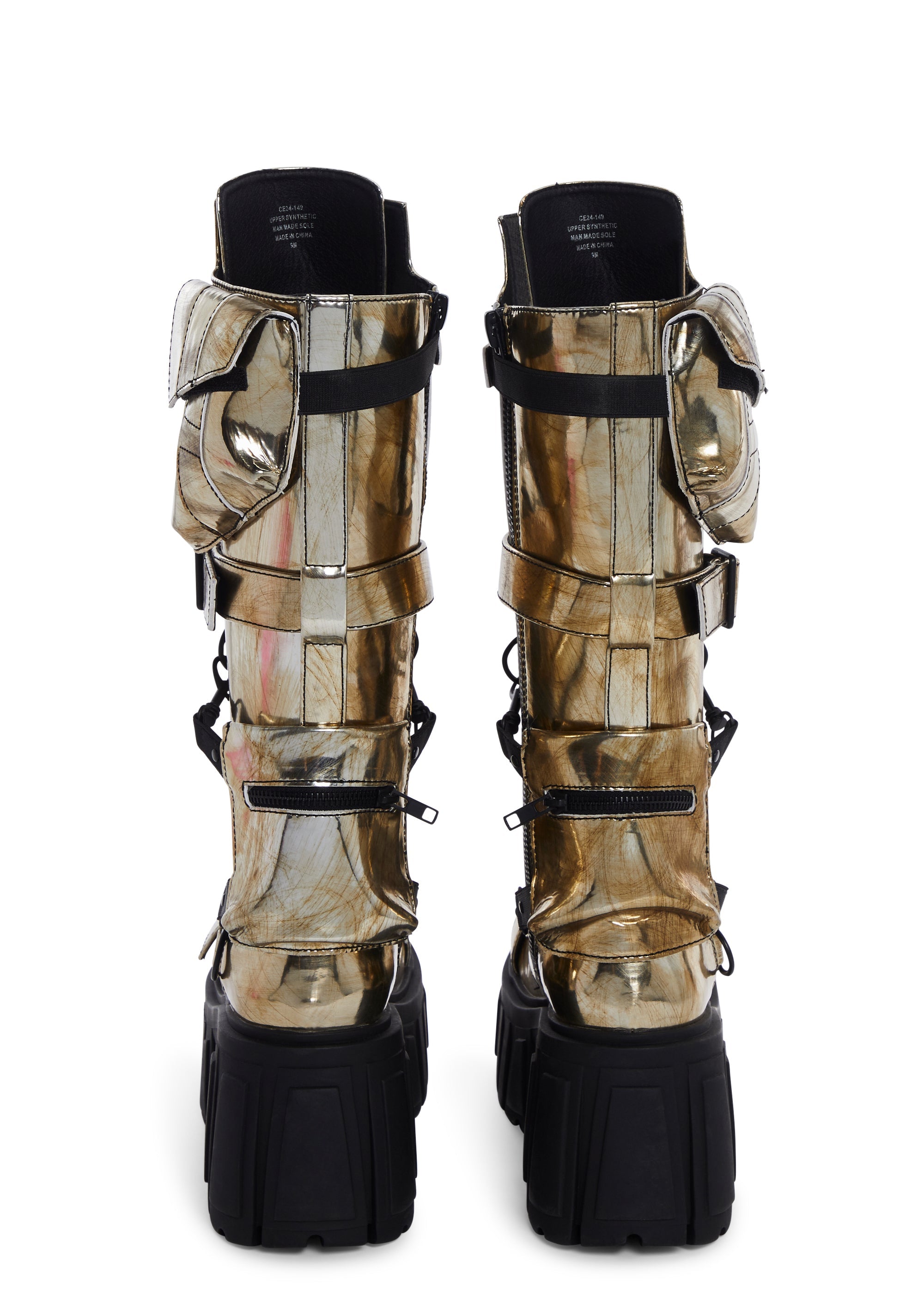 cuz you are a force to be reckoned with. These boots have a vegan leather construction, a distressed metallic silver finish, treaded platform soles, block heels, removable pockets on the sides with velcro and zipper closures, D-ring hardware, a decorative buckle on the uppers, front lace-ups, and side zipper closures.
