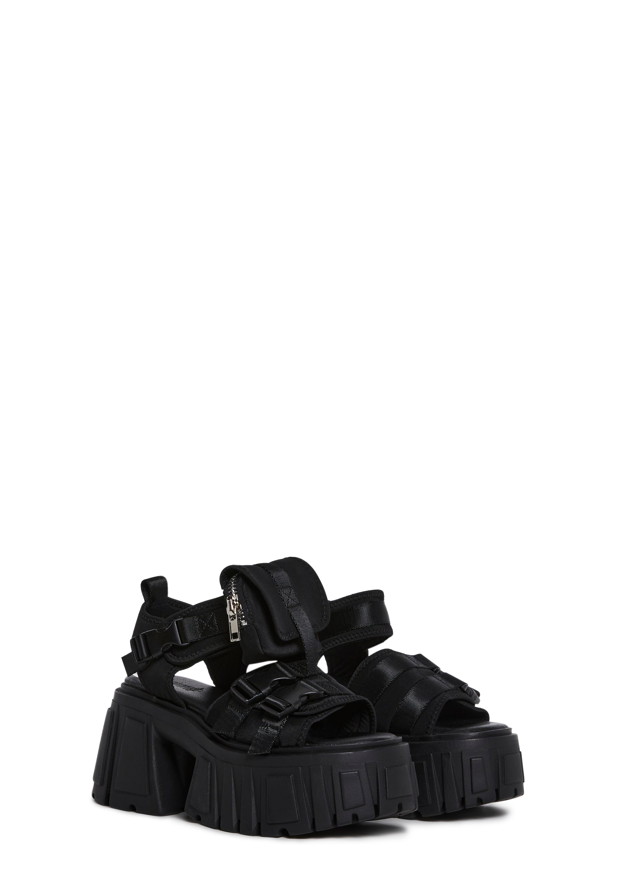 have a nylon construction and click buckle closures. With a removable zippered pocket on one shoe, and platform soles.