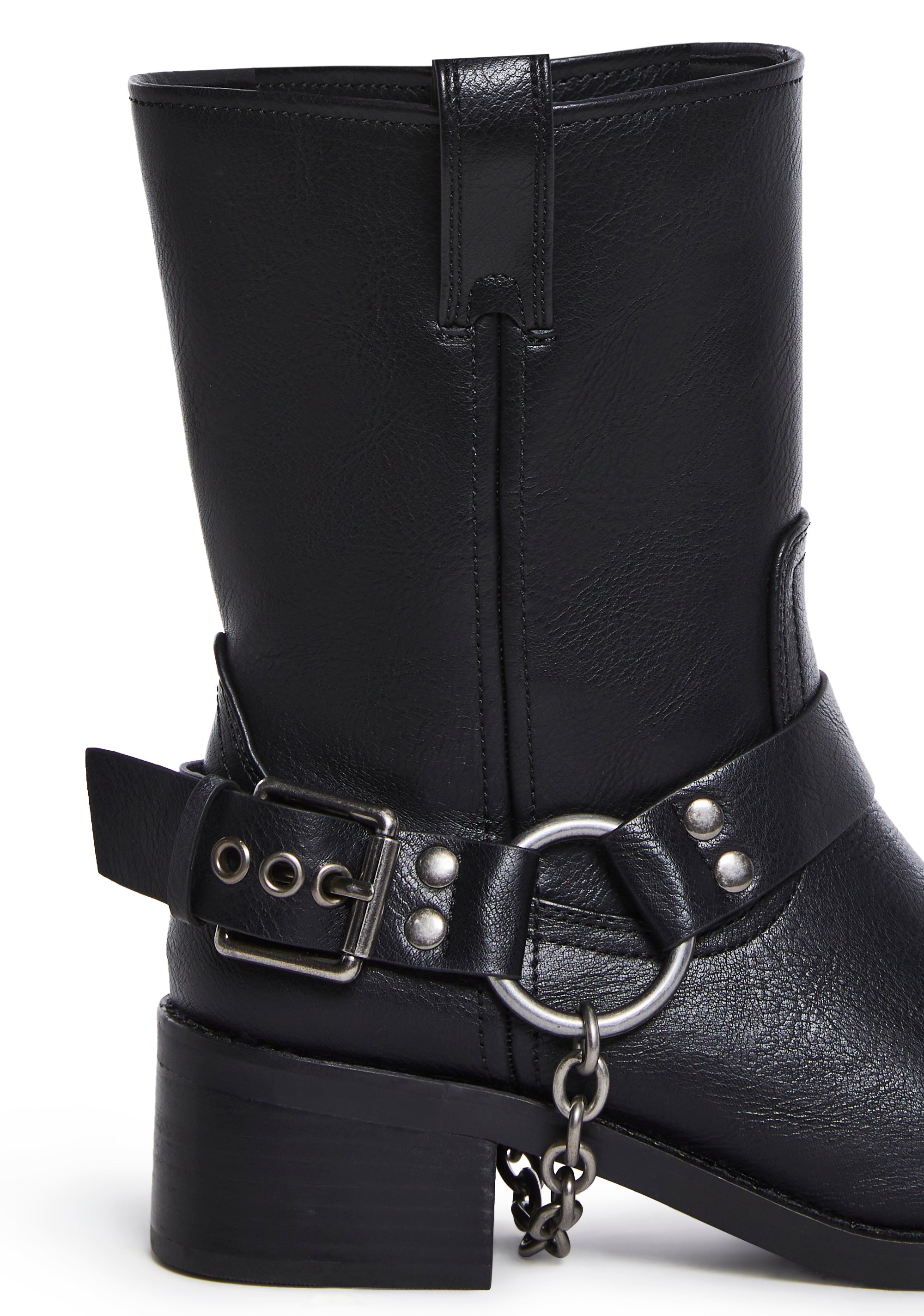 Don’t look back as you wear these boots that have a vegan leather construction, a square toe design, O-ring hardware, attached chain link, adjustable buckle details, and a pull on fit.
