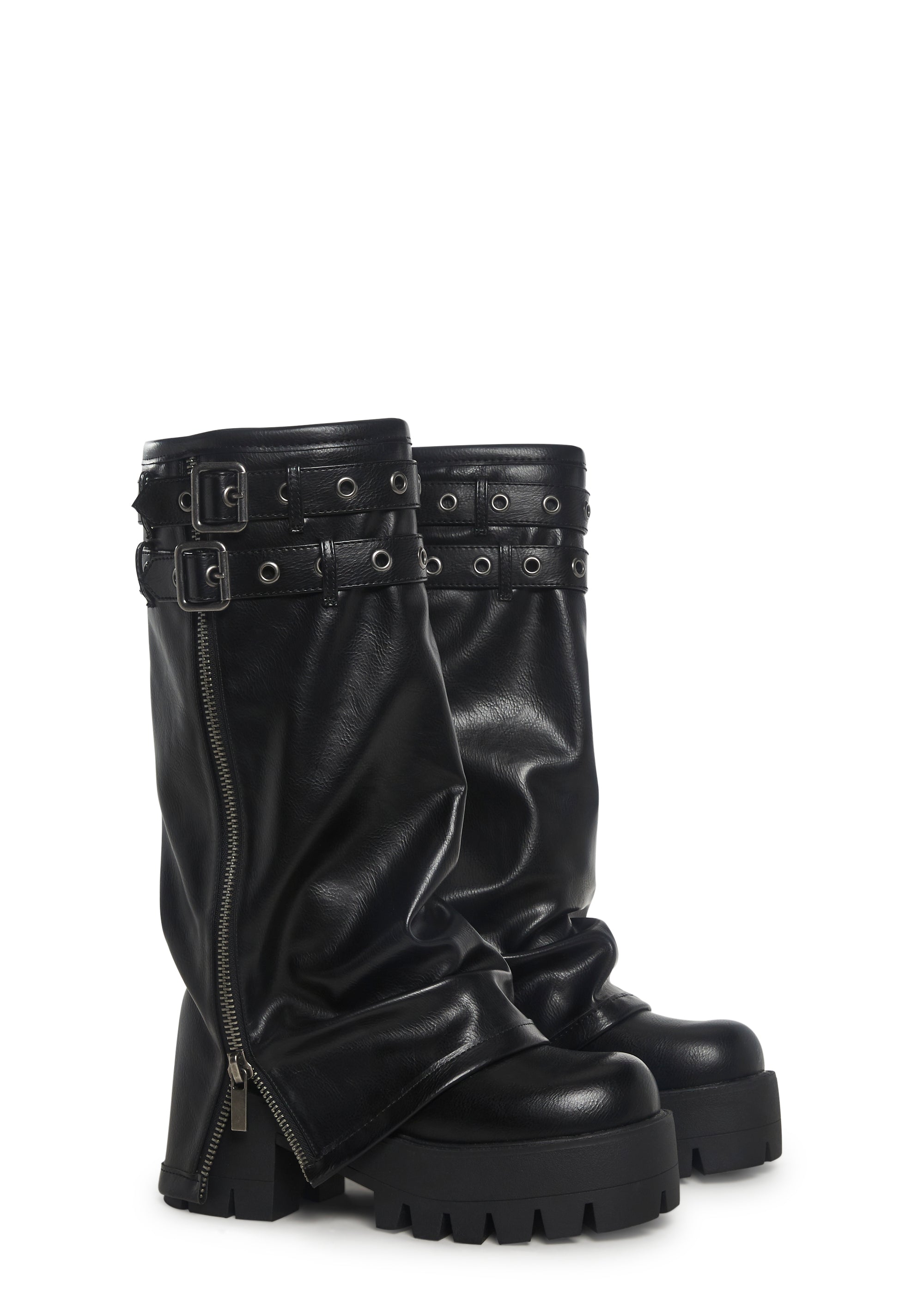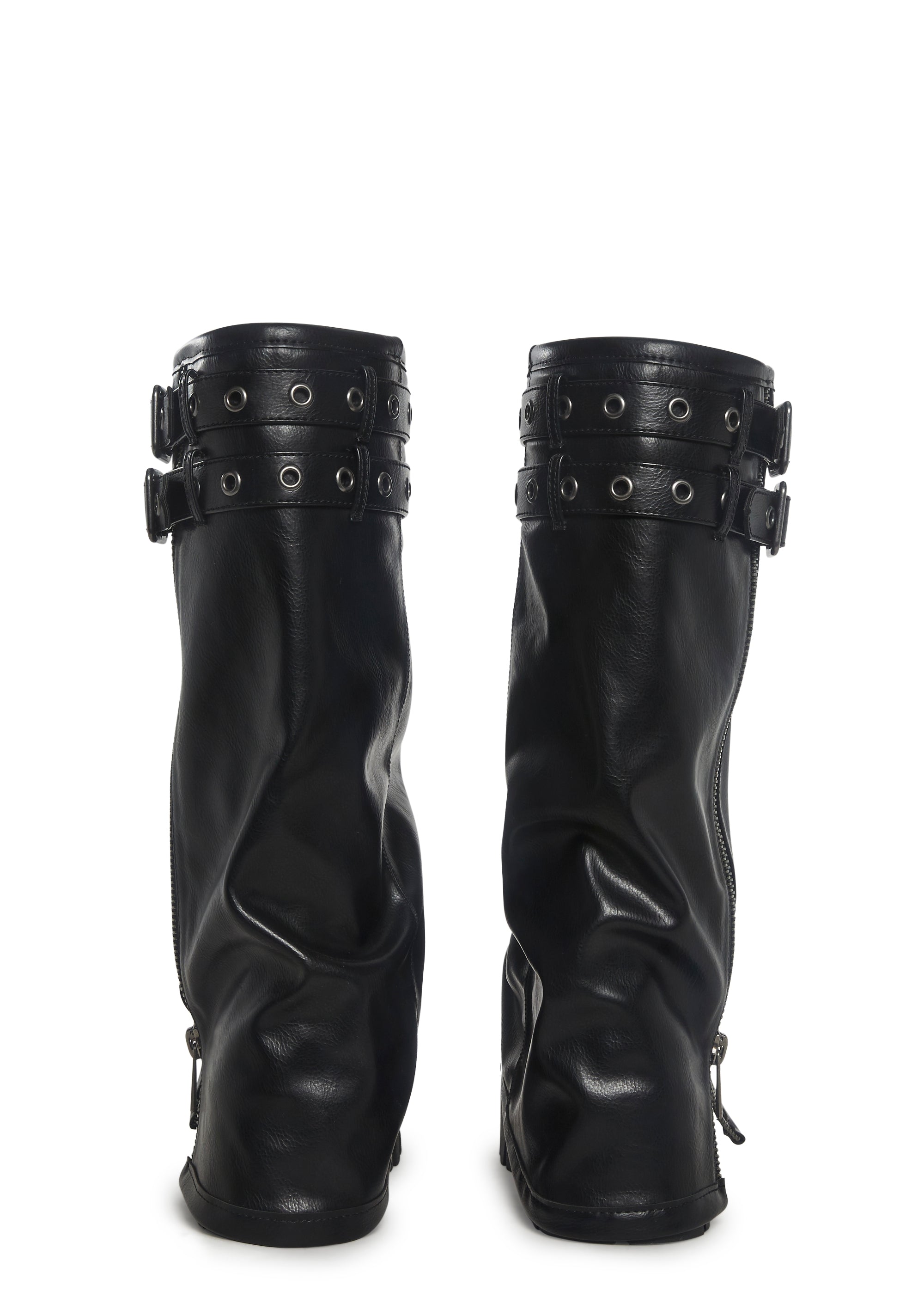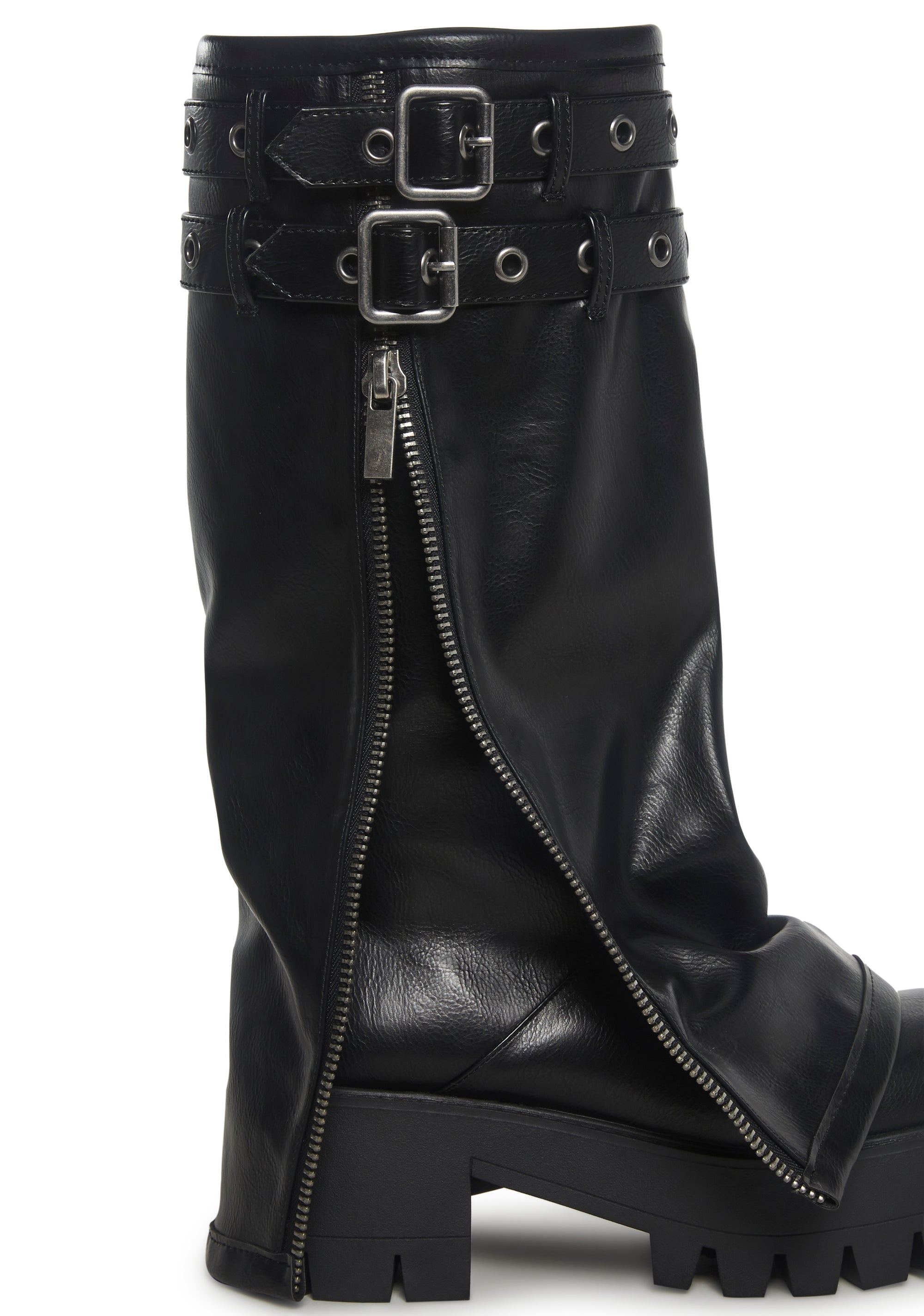 In a vegan leather construction with treaded soles. With an attached pant with adjustable buckles and zippers.
