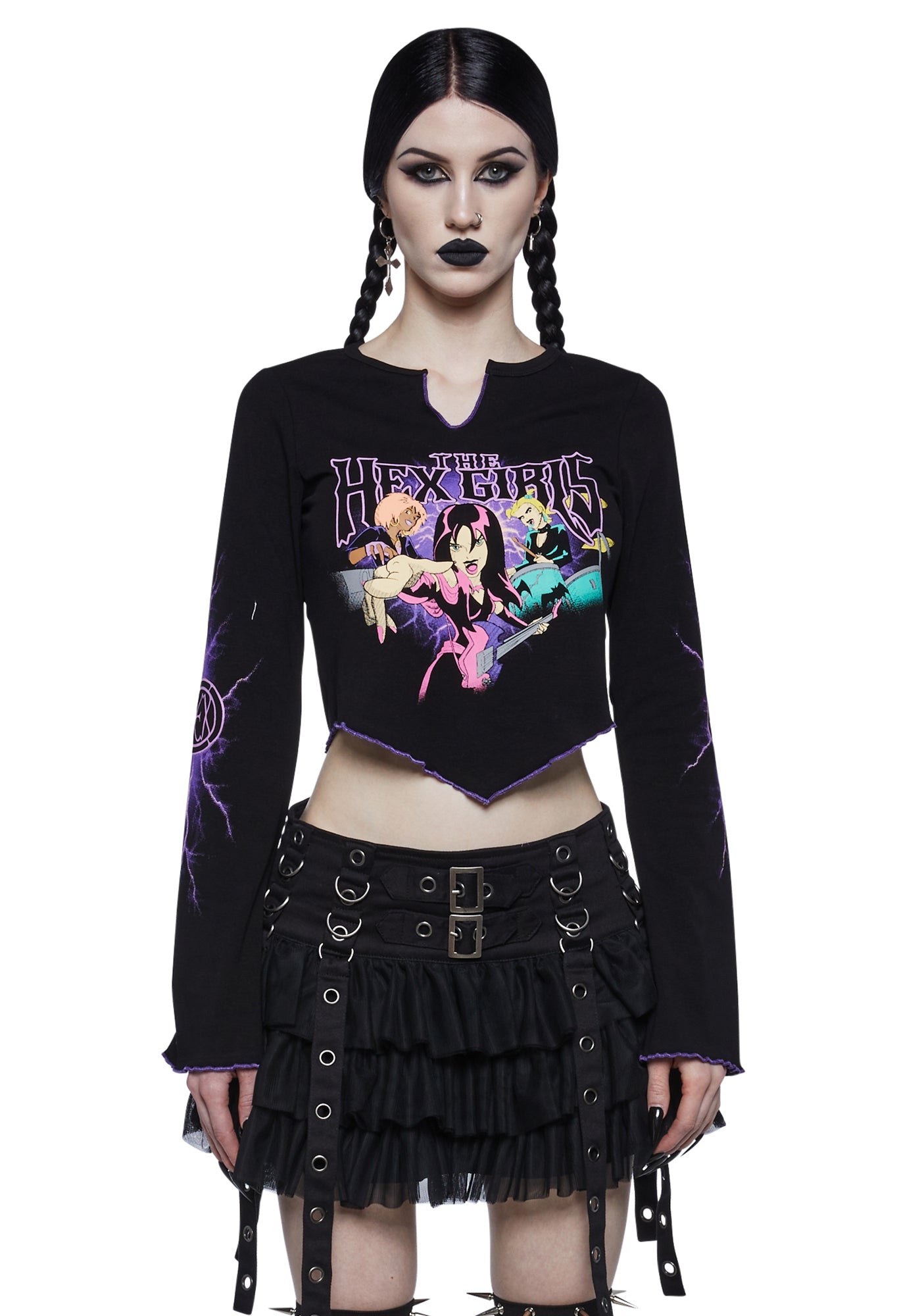 cuz they are good bad girls. Get rocking with this top that has long bell sleeves, a printed design of the Hex Girls on the front, "hex" word graphics on the sleeves, a contrast colored lettuce trim on the neckline, sleeves, and hem, a pointed hem, a