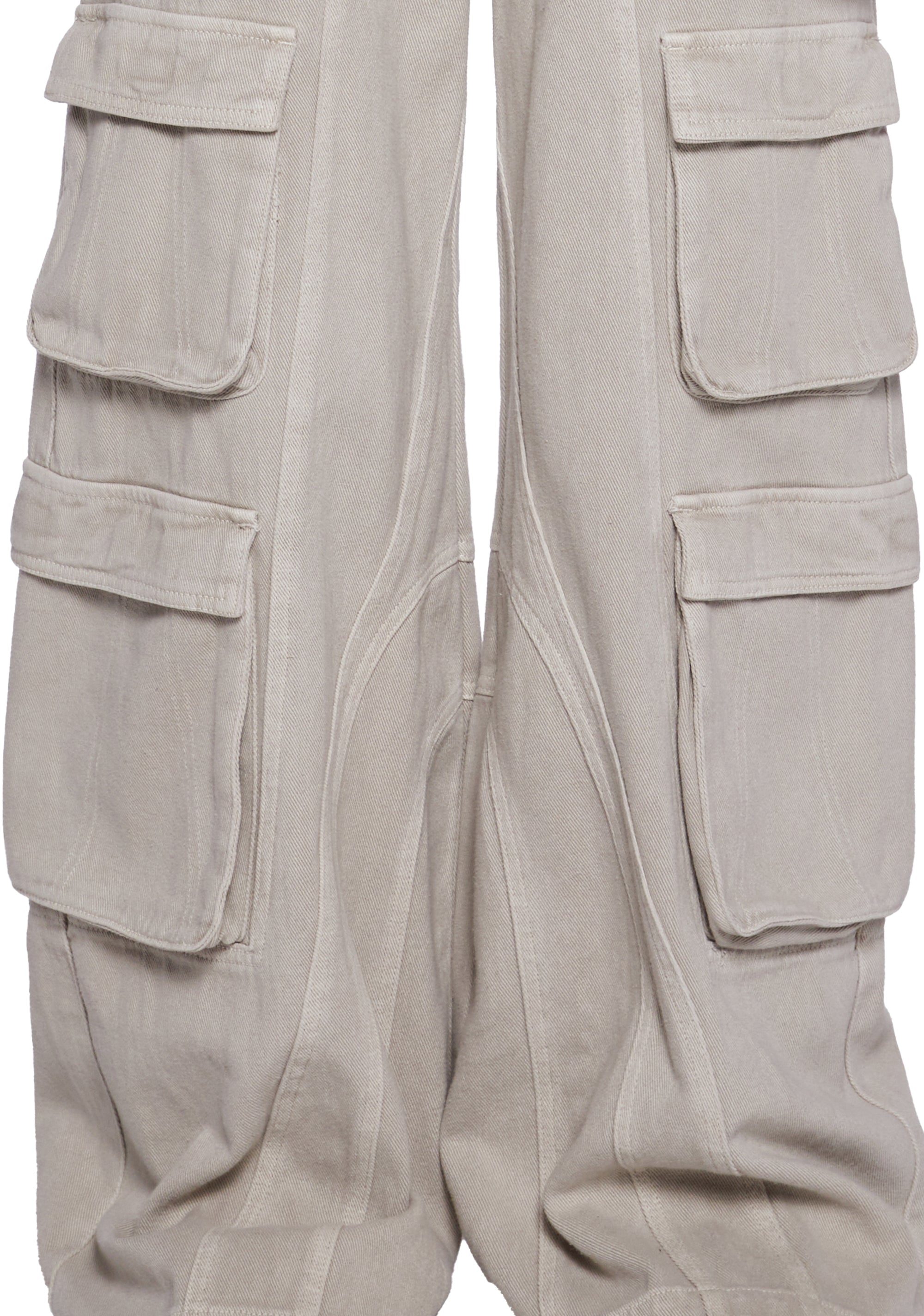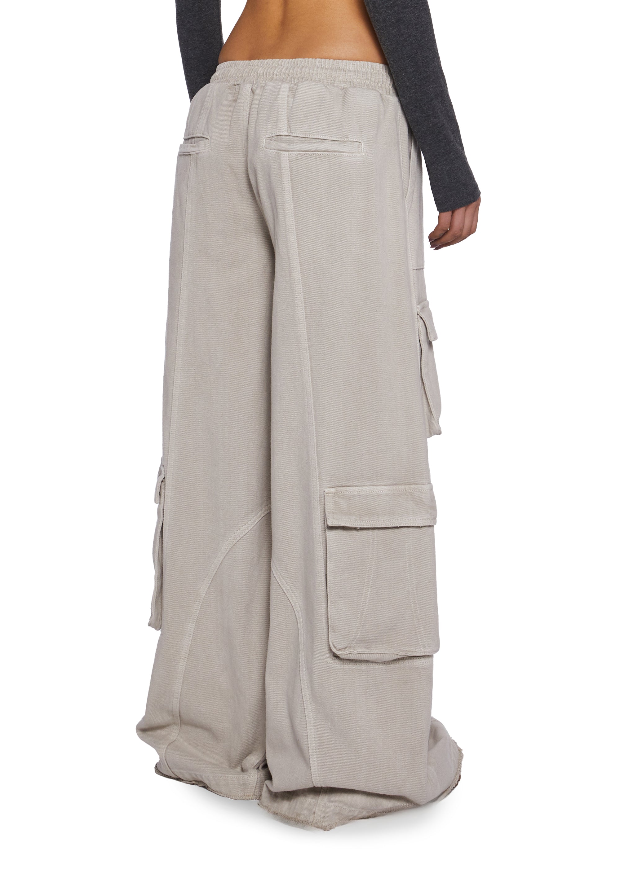 These pants have a twill construction, an elastic waistband, two cargo pockets on the sides with velcro closures, side cargo pockets, decorative back pockets, side pockets, extremely baggy, and a distressed hem.