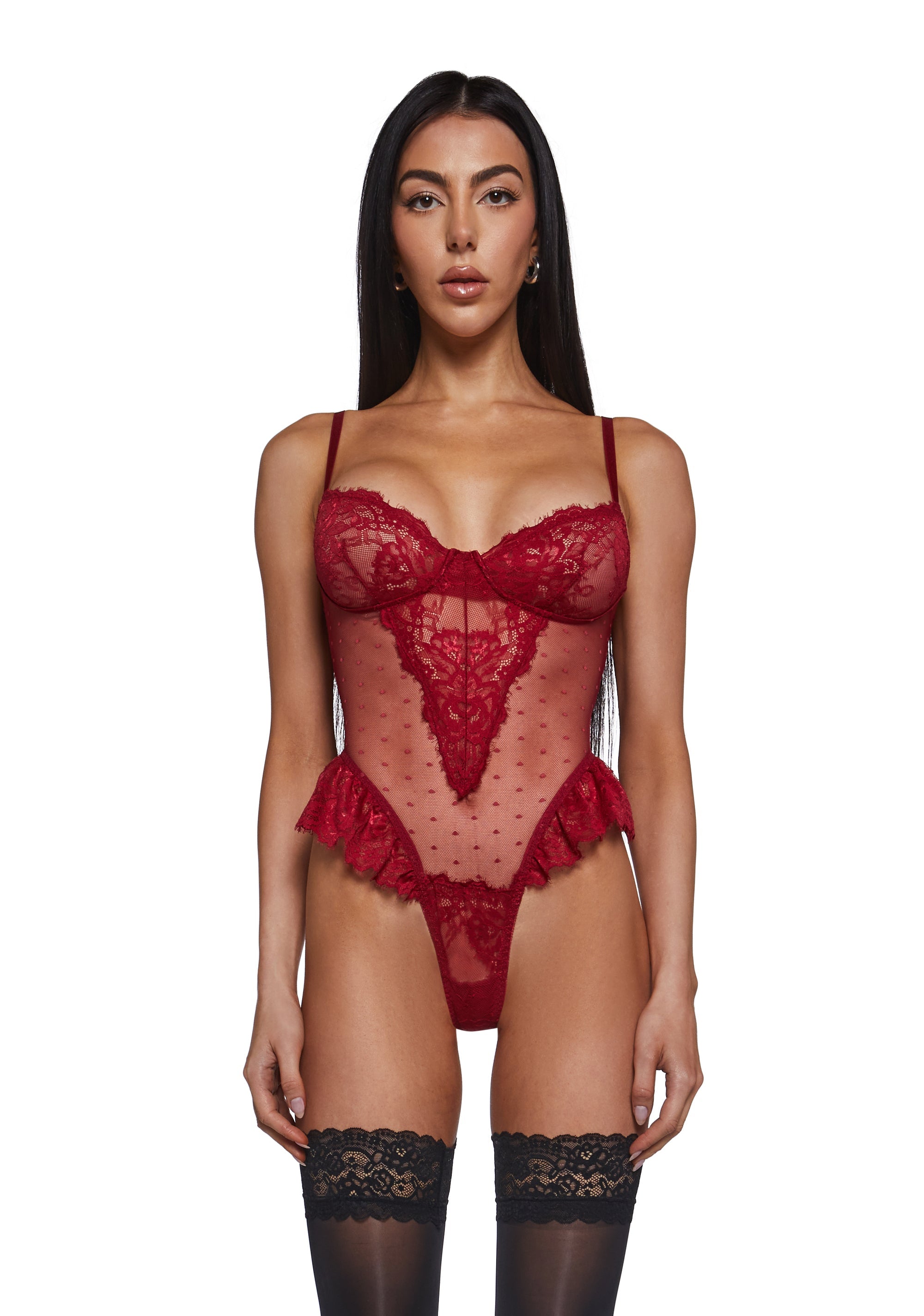 A bold red lace bodysuit crafted with sheer mesh and intricate detailing for a sultry, sculpting fit. Designed to highlight curves with a modern lingerie silhouette, this piece delivers effortless confidence and allure.