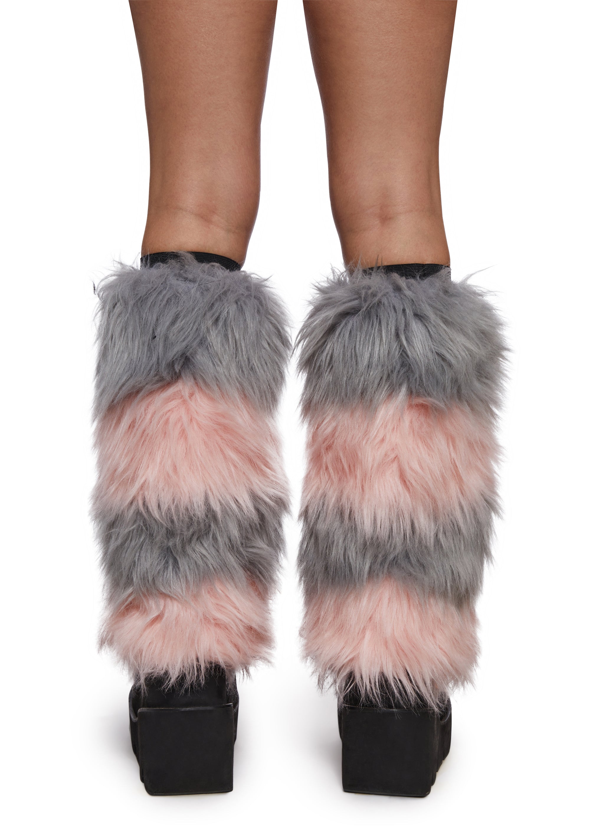 Turn heads with these striped fur leg warmers featuring plush faux-fur panels in soft grey and blush tones and a cozy slip-on fit. Perfect for adding texture, warmth, and bold style to your winter or festival looks.