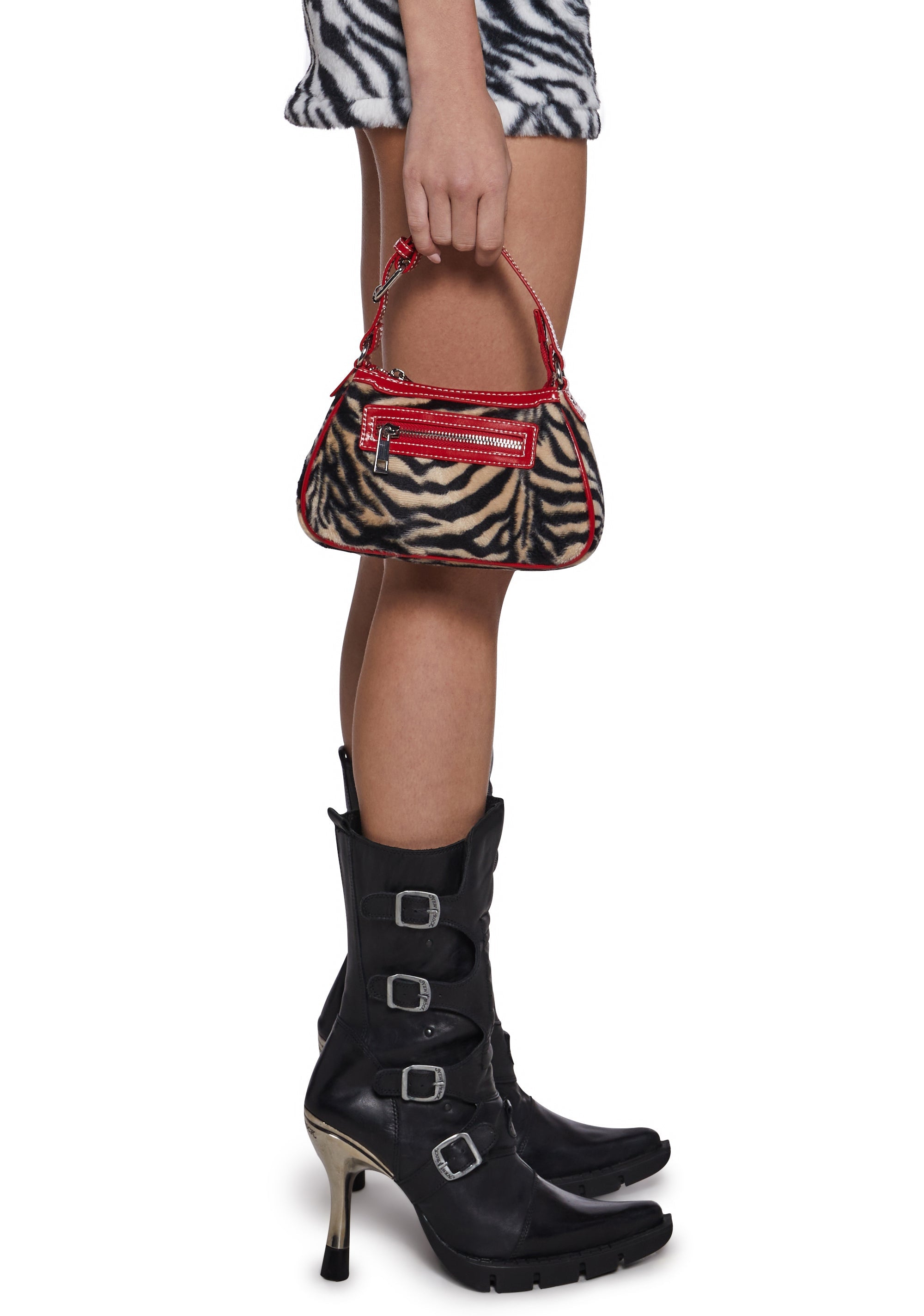 Make a bold zebra-print statement with the Zebra Mood Shoulder Bag. This eye-catching shoulder bag features all-over faux zebra print, contrast vinyl trim, an adjustable shoulder strap, a front zippered pocket, and a top zipper closure, perfect for carrying your essentials with flair.