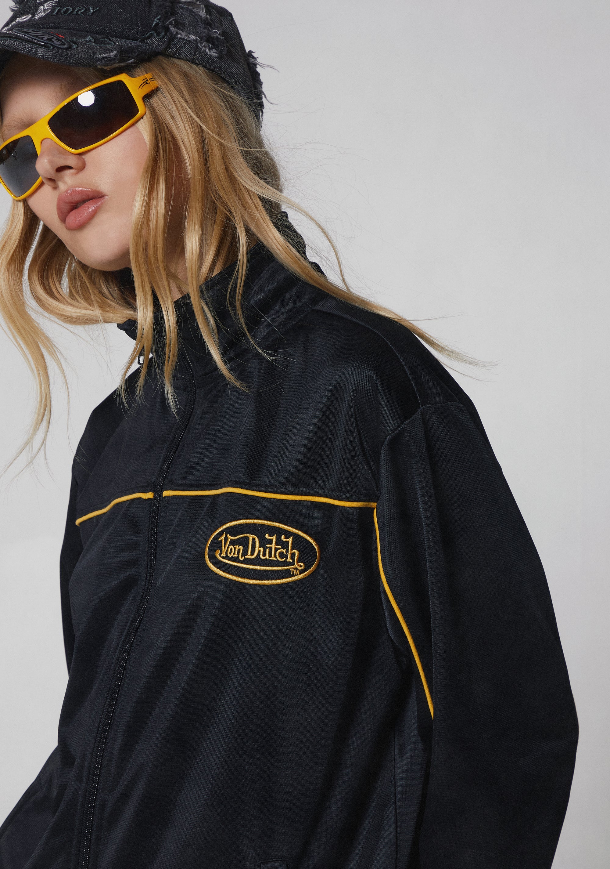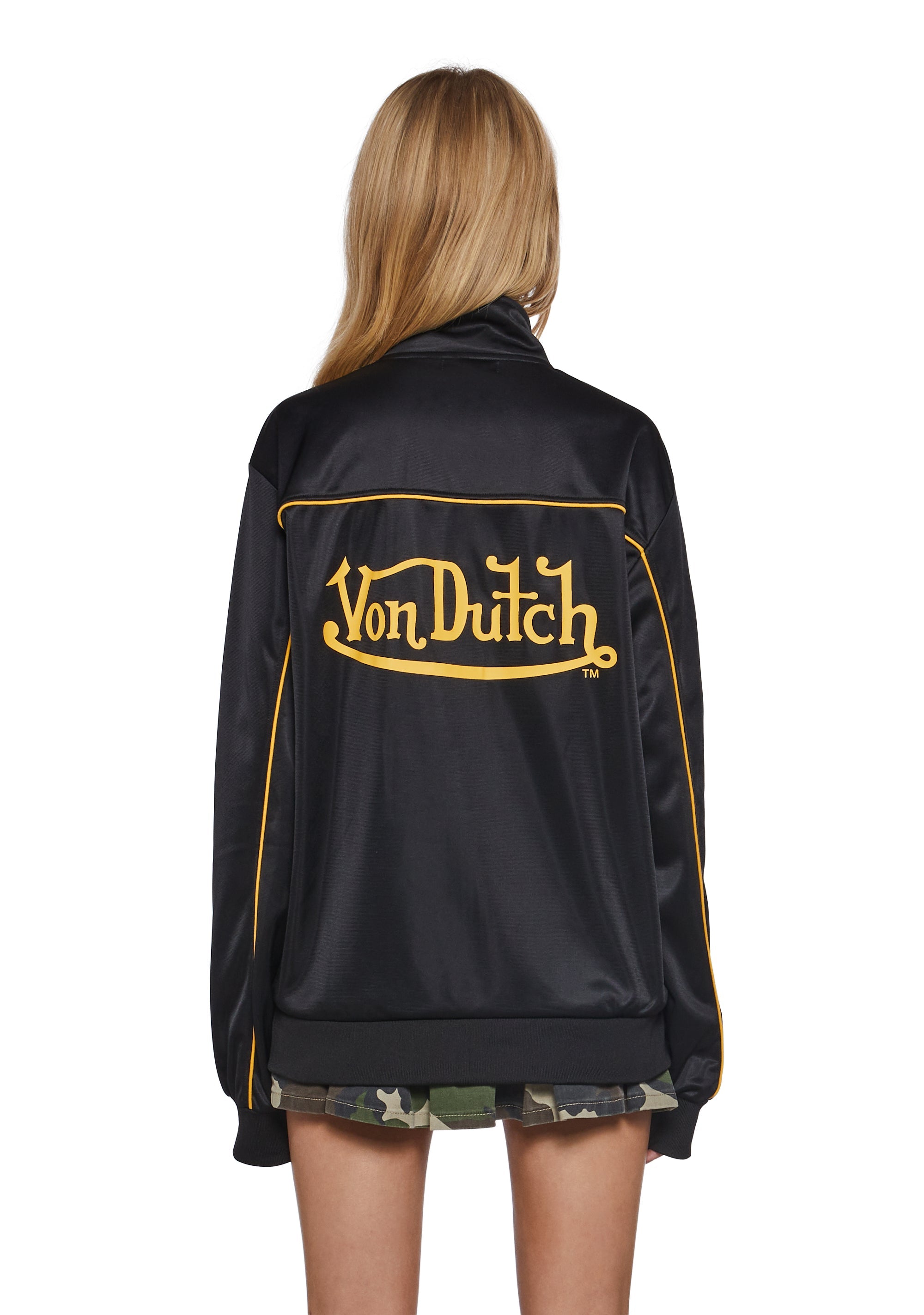 This jacket has a nylon construction, contrast colored piping, side pockets, long sleeves, Von Dutch logo on the back and embroidered patch on the front, and a front zipper closure. A Dolls Kill Exclusive.